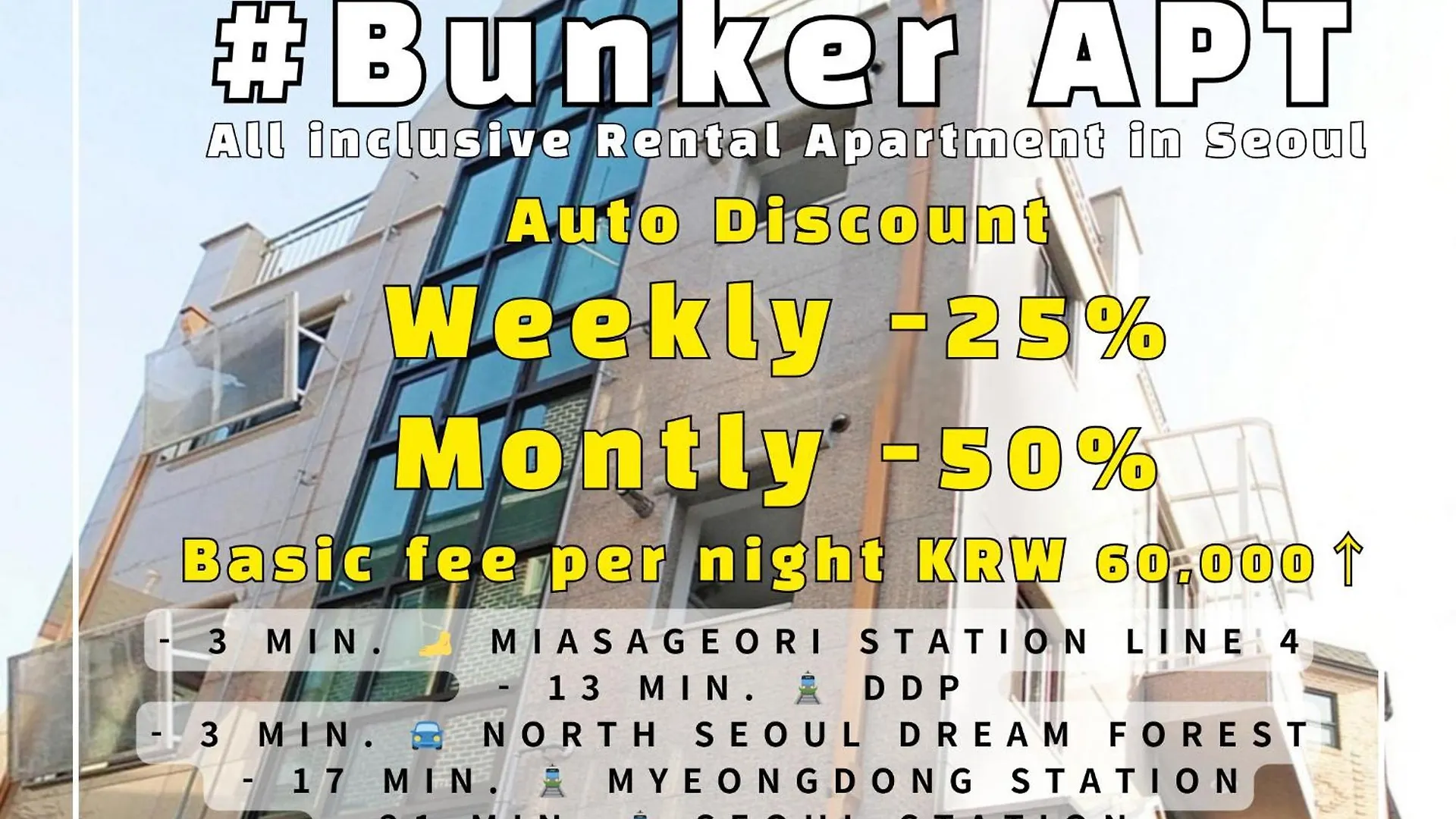 Seoul Rental Apartment Fully Furnished #Bunker Apt, Near Miasageori Subway Station Line 4